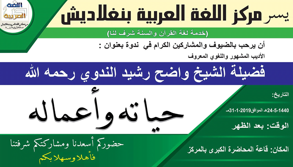 أفادت وسائل الإعلام ومواقع التواصل الاجتماعي أن مركز اللغة العربية بنغلاديش سيقوم بعقد أول ندوة في بنغلاديش لاستعادة ذكرى فضيلة الشيخ محمد واضح رشيد الندوي (رحمه الله ) مساء الخميس 31 يناير / كانون الثاني2019، وذلك في صالة المركز بمنطقة "واشبور" التابعة لمخفر شرطة "محمدبور" قرب العاصمة "داكا"، التي تتمحور حول مآثر الشيخ الأدبية والفنية وحياته الملئية بالأنشطة الدعوية والتعليمية.